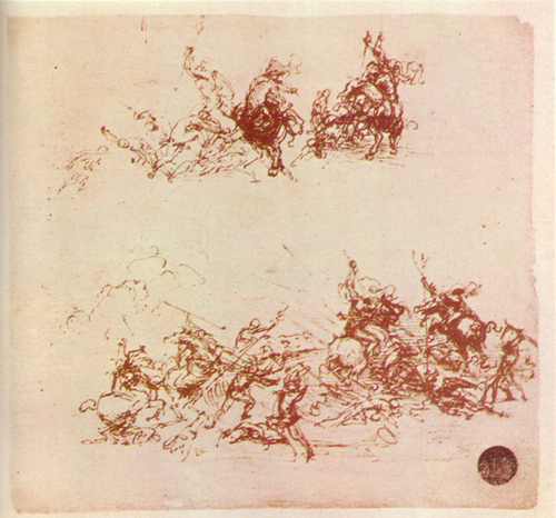 Furthermore, the lower part of the drawing depicts a battle scene between infantrymen, indicating that Leonardo intended to place such battle scenes between infantrymen around battle scenes centered on horses.