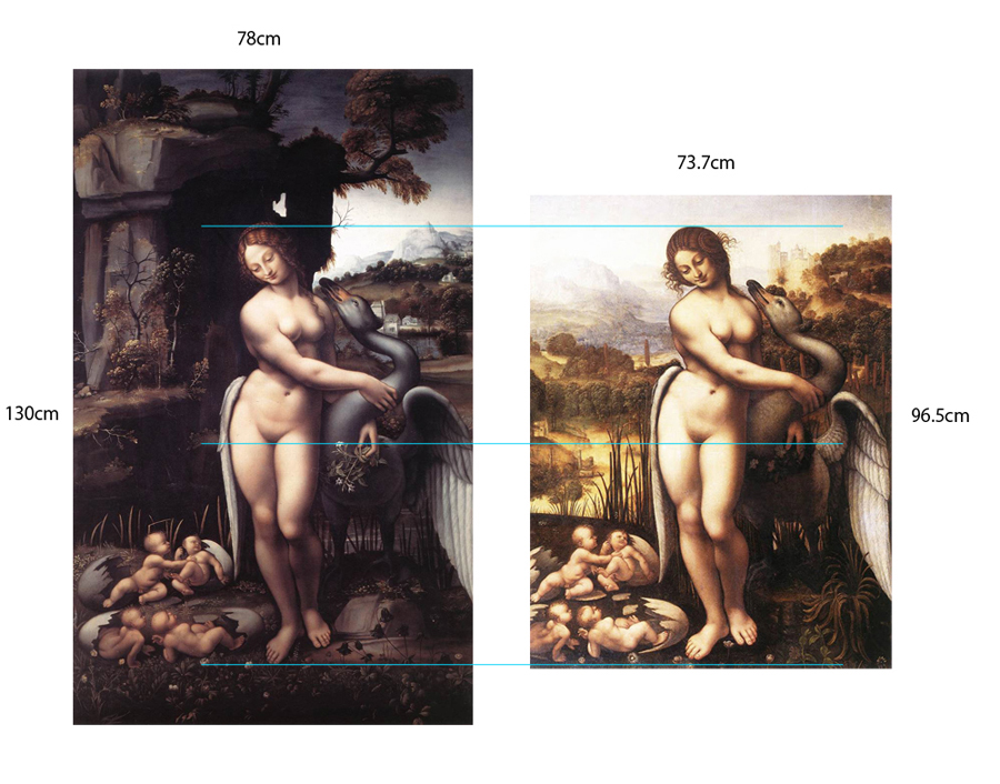 The image below is a comparison of the two works. The images are scaled and arranged so that the vertical size of Leda and the Swan from the Uffizi Gallery on the left is 130 cm, and the vertical size of Leda and the Swan from Wilton House Trust on the right is 96.5 cm. You can see that Leda is the same exact size in these two works.