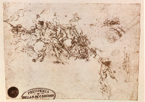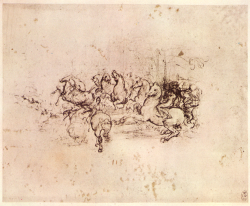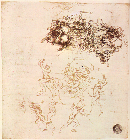 Furthermore, the lower part of the drawing depicts a battle scene between infantrymen, indicating that Leonardo intended to place such battle scenes between infantrymen around battle scenes centered on horses.